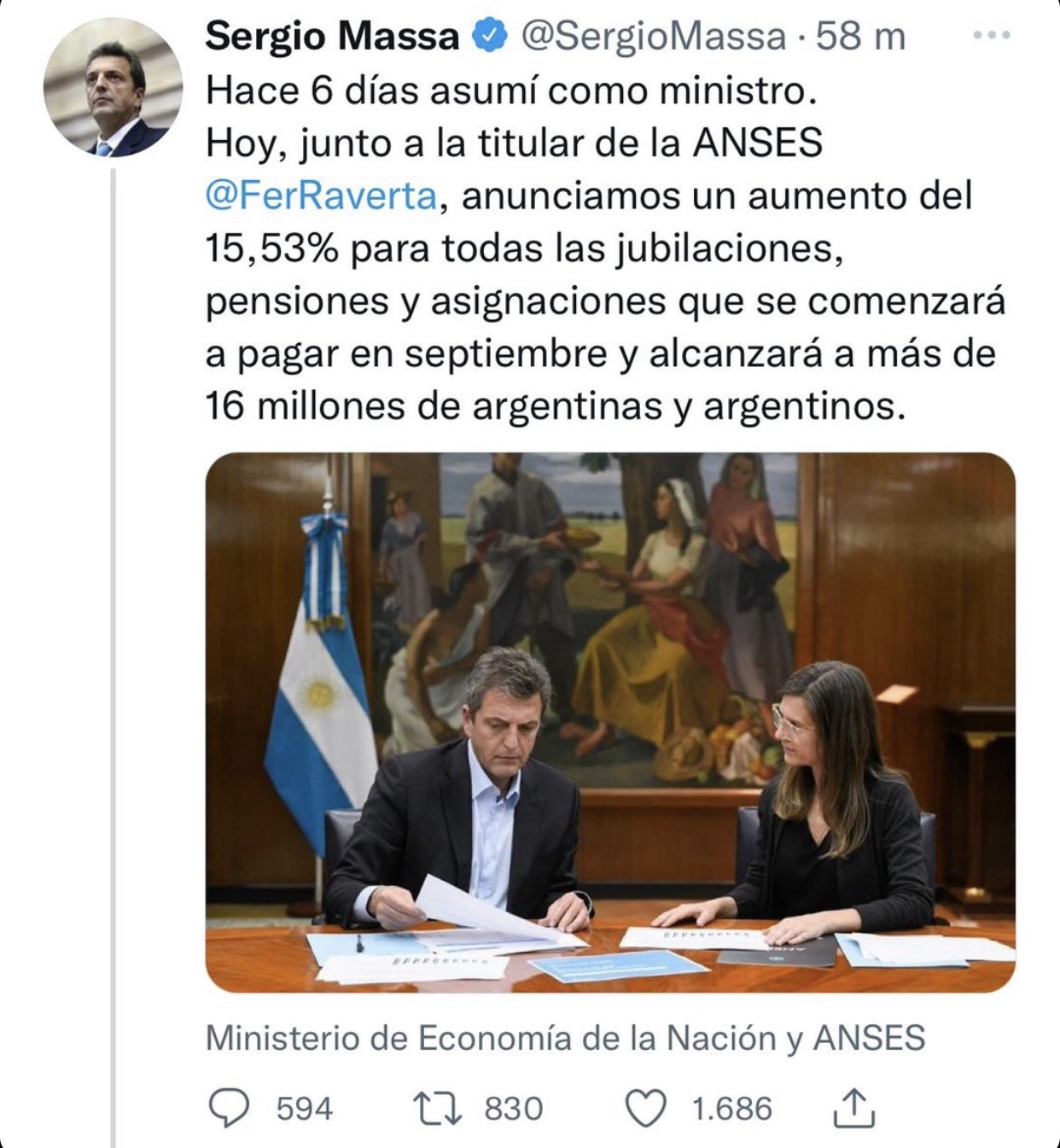 Hoy, junto a la titular de la ANSES @FerRaverta, anunciamos un aumento del 15,53% para todas las jubilaciones, pensiones y asignaciones que se comenzará a pagar en septiembre y alcanzará a más de 16 millones de argentinas y argentinos.” “ Además, a este aumento se le suma un refuerzo mensual que se pagará en los meses de septiembre, octubre y noviembre hasta el próximo aumento por movilidad de diciembre. Esta medida alcanzará a casi 6.1 millones de jubilados y pensionados.” Expresó .