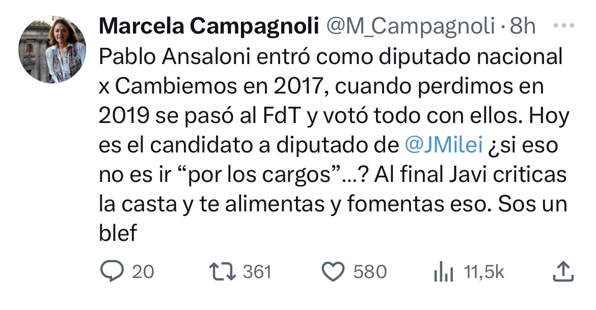 Pablo Ansaloni entró como diputado nacional x Cambiemos en 2017, cuando perdimos en 2019 se pasó al FdT y votó todo con ellos. Hoy es el candidato a diputado de @JMilei ¿si eso no es ir “por los cargos”…? Al final Javi criticas la casta y te alimentas y fomentas eso. Sos un blef. Expresó Marcela Campagnoli.