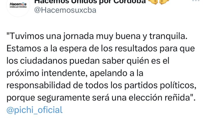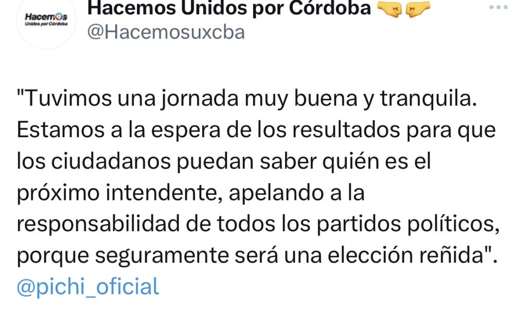 “Tuvimos una jornada muy buena y tranquila. Estamos a la espera de los resultados para que los ciudadanos puedan saber quién es el próximo intendente, apelando a la responsabilidad de todos los partidos políticos, porque seguramente será una elección reñida». #pichi_oficial publicaron desde las redes sociales de Hacemos.