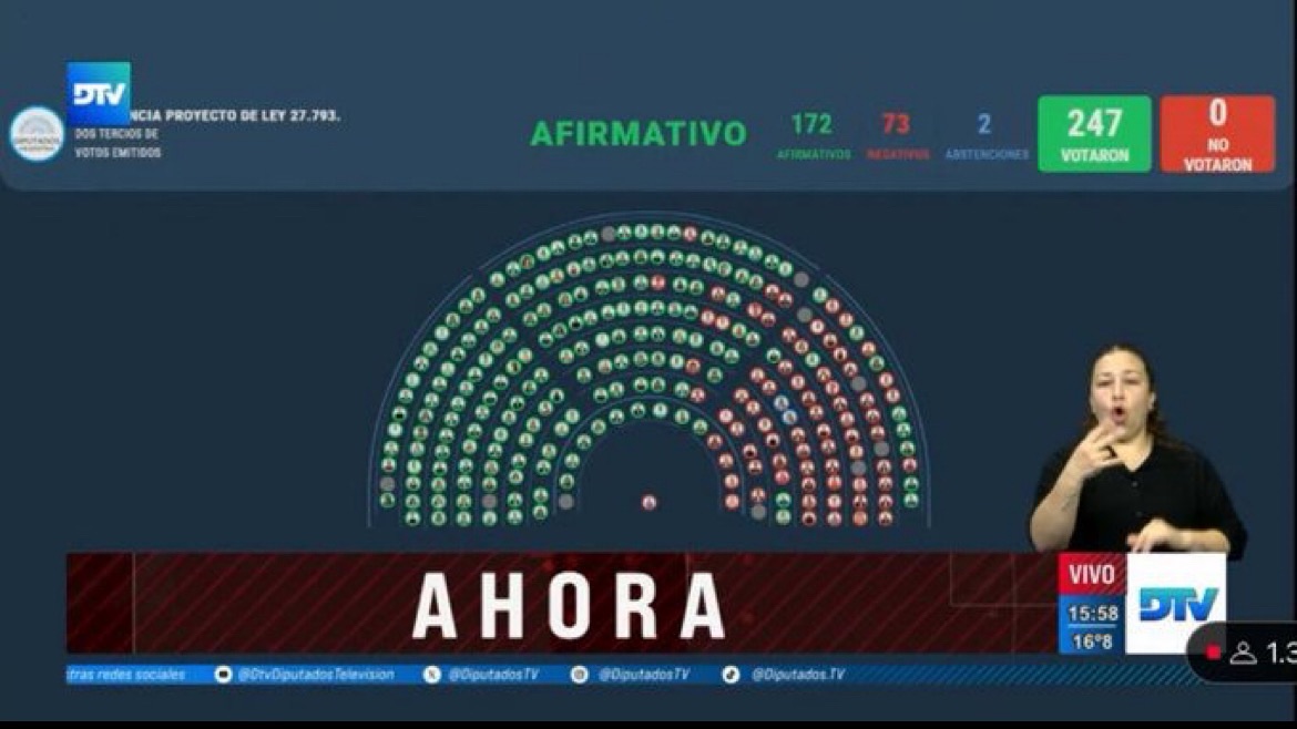 Con 172 votos a favor, 73 en contra y 2 abstenciones, Diputados logró los dos tercios para insistir con la sanción original de la Ley de Emergencia en Discapacidad, rechazando así el veto de Javier Milei.