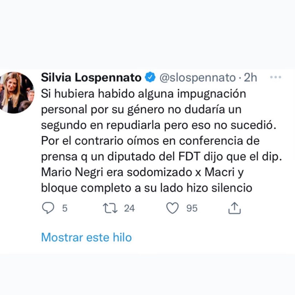 Silvia Lospennato ( Dip y Secretaria Parlamentaria de JxC ) afirmó ; “Si hubiera habido alguna impugnación personal por su género no dudaría un segundo en repudiarla pero eso no sucedió. Por el contrario oímos en conferencia de prensa q un diputado del FDT dijo que el dip. Mario Negri era sodomizado x Macri y bloque completo a su lado hizo silencio”