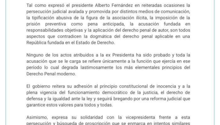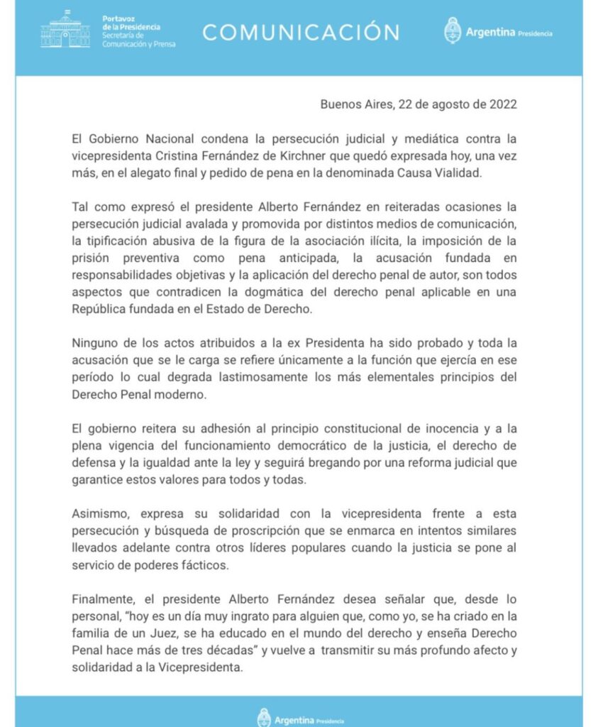 Alberto condenó “la persecución judicial y mediática” contra Cristina Kirchner, luego del pedido de condena del fiscal Luciani , tras un comunicado de prensa segundos después , que el fiscal Diego Luciani pidiera una condena de 12 años para la vicepresidenta , tras el alegato final y pedido de pena en la denominada Causa Vialidad.