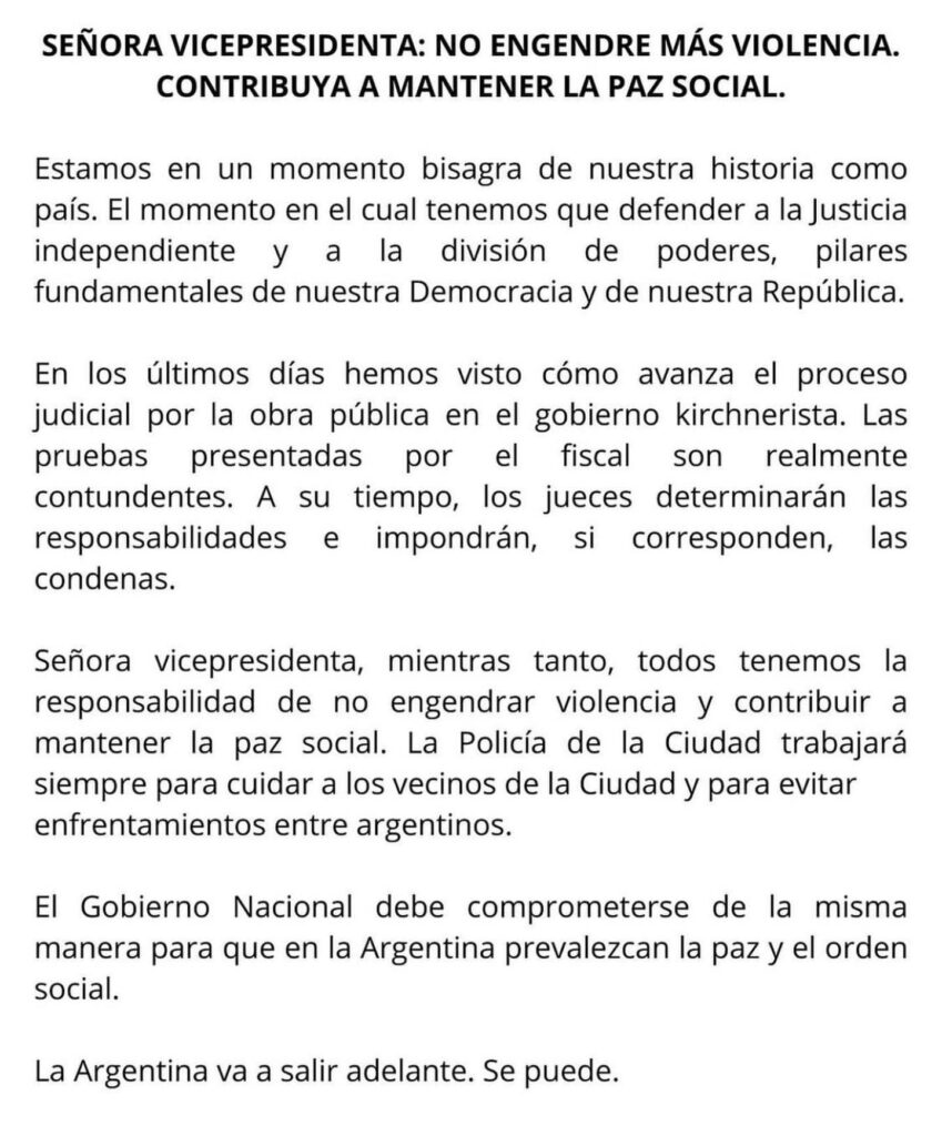 Horacio Rodríguez Larreta le contestó a la vicepresidenta Cristina Kirchner: “No engendre más violencia”. “ la Policía de la Ciudad trabajará para evitar enfrentamientos entre argentinos”. “ Estamos en un momento bisagra de nuestra historia como país. El momento en el cual tenemos que defender a la Justicia independiente y a la división de poderes, pilares fundamentales de nuestra Democracia y de nuestra República”, afirmó.