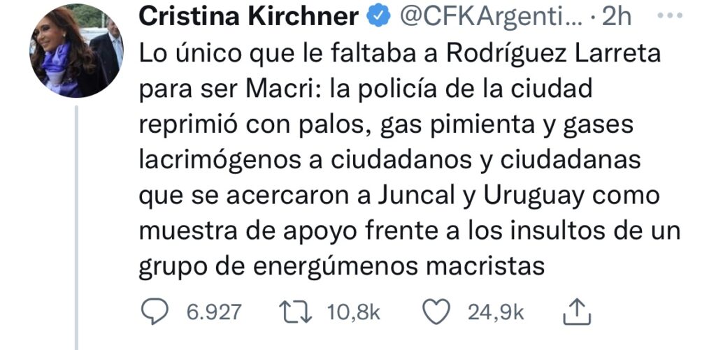 Mientras que Cristina había publicado desde su cuenta oficial de twittear: “ Lo único que le faltaba a Rodríguez Larreta para ser Macri: la policía de la ciudad reprimió con palos, gas pimienta y gases lacrimógenos a ciudadanos y ciudadanas que se acercaron a Juncal y Uruguay como muestra de apoyo frente a los insultos de un grupo de energúmenos macristas . “ continúa “ Jamás, ningún militante ni simpatizante de nuestro espacio político ha ido al domicilio de ningún dirigente macrista a insultarlos. Ni a la casa de Macri, ni a la de Rodríguez Larreta, ni a la de Bullrich o Vidal.”