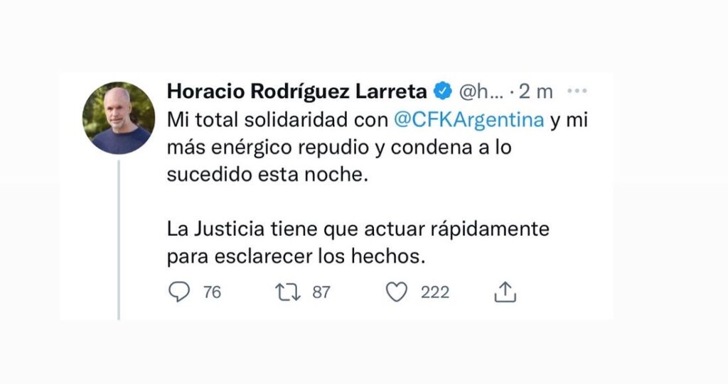Mi total solidaridad con @CFKArgentina y mi más enérgico repudio y condena a lo sucedido esta noche.