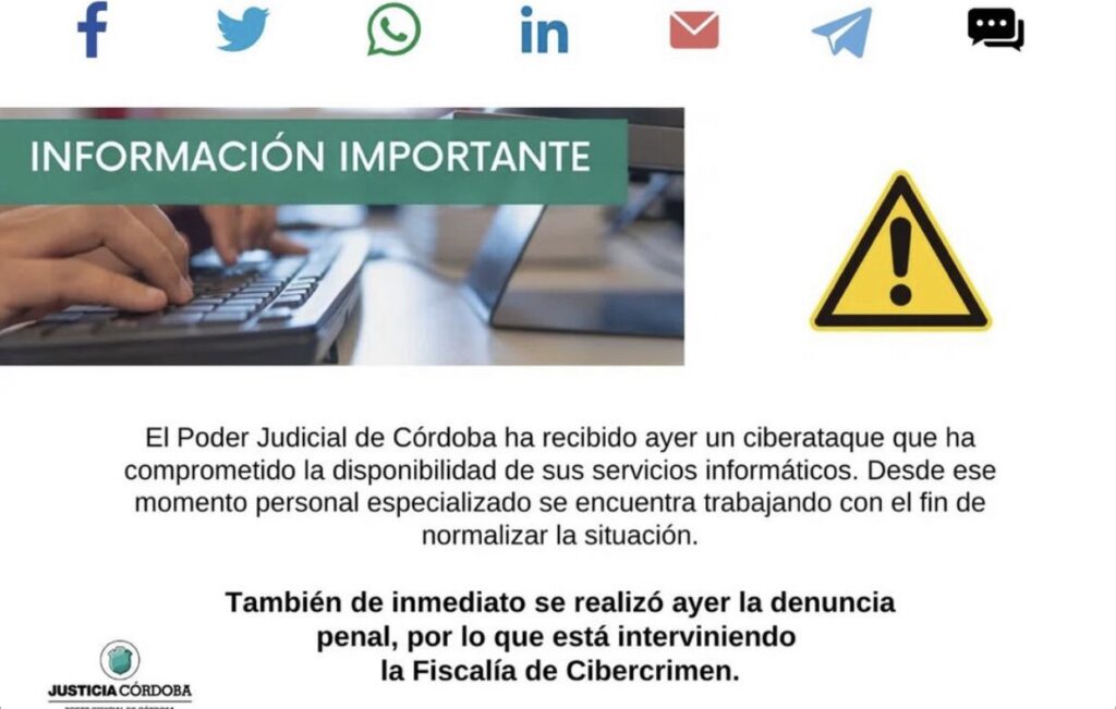 Por el tema Interviene la Fiscalía de Cibercrimen , desde la cuenta de Twitter oficial publicaron “ El Poder Judicial de Córdoba ha recibido ayer un ciberataque que ha comprometido la disponibilidad de sus servicios informáticos. Desde ese momento personal especializado se encuentra trabajando con el fin de normalizar la situación”. “ También, de inmediato, se realizó la denuncia penal, por lo que está interviniendo la Fiscalía de Cibercrimen”.