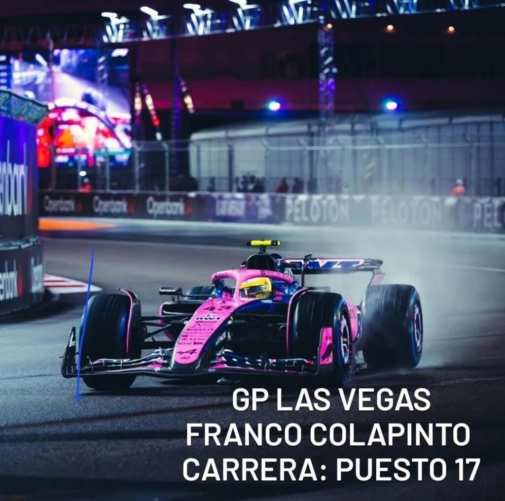 La carrera de Franco Colapinto en Las Vegas fue complicada. Largó en el 15º puesto y, debido a un toque con Alex Albon, su Alpine sufrió daños en el difusor trasero, lo que afectó su rendimiento. Perdió posiciones y terminó en el 17º lugar, aunque luego subió al 15º después de la descalificación de los McLaren de Lando Norris y Oscar Piastri.