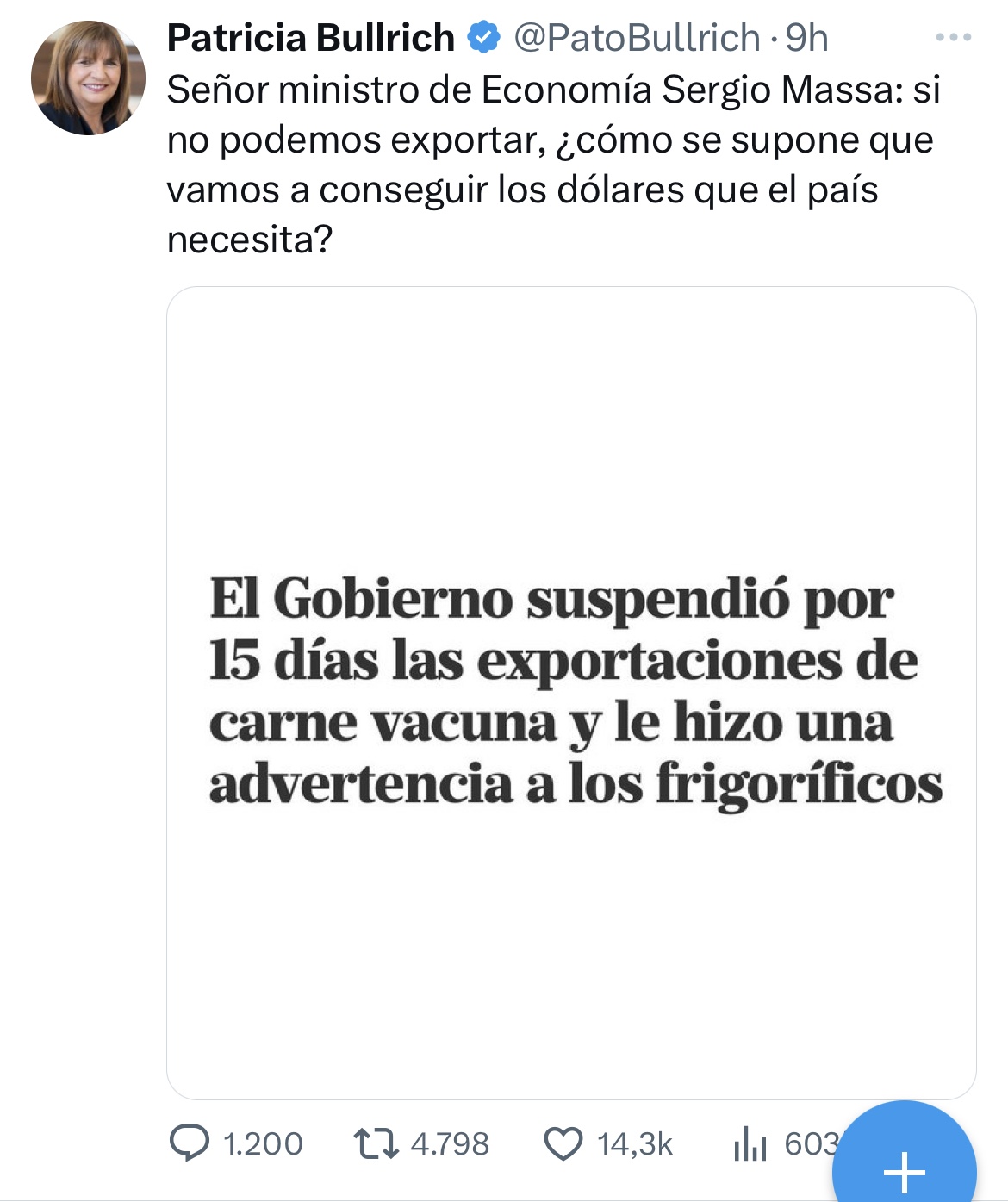 Tras la decisión del Gobierno de suspender por 15 días las exportaciones de 🥩 carne, desde la oposición, la candidata a presidente @patobullrich publicó ; Señor ministro de Economía Sergio Massa: si no podemos exportar, ¿cómo se supone que vamos a conseguir los dólares que el país necesita?.