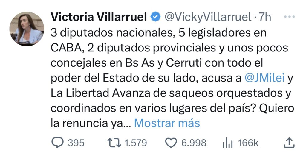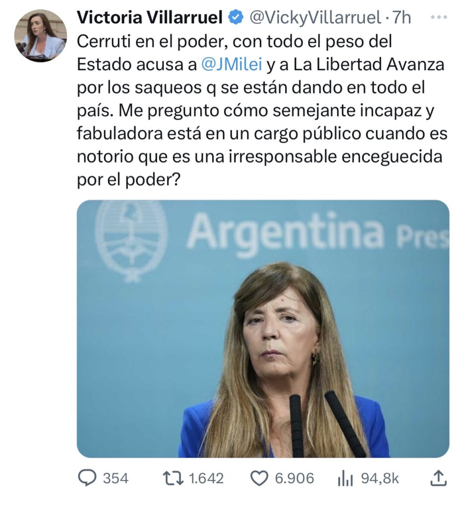 “ Cerruti en el poder, con todo el peso del Estado acusa a @JMilei y a La Libertad Avanza por los saqueos q se están dando en todo el país. Me pregunto cómo semejante incapaz y fabuladora está en un cargo público cuando es notorio que es una irresponsable enceguecida por el poder?” Posteo Villarruel. Continuó en la cuenta “ X” 3 diputados nacionales, 5 legisladores en CABA, 2 diputados provinciales y unos pocos concejales en Bs As y Cerruti con todo el poder del Estado de su lado, acusa a @JMilei y La Libertad Avanza de saqueos orquestados y coordinados en varios lugares del país? Quiero la renuncia ya de esta irresponsable! La denunciaremos por usar su cargo para amedrentar y sembrar el terror en la ciudadanía.”