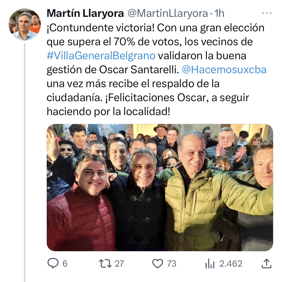 Martín Llaryora también agregó ; ¡Contundente victoria! Con una gran elección que supera el 70% de votos, los vecinos de #VillaGeneralBelgrano validaron la buena gestión de Oscar Santarelli. @Hacemosuxcba una vez más recibe el respaldo de la ciudadanía. ¡Felicitaciones Oscar, a seguir haciendo por la localidad!.
