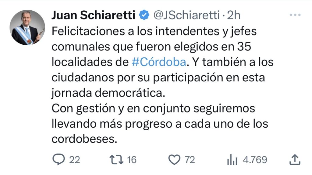 los principales referentes los comunicaron en sus cuentas de Twittear, el Gobernador Schiaretti publicó ; “ Felicitaciones a los intendentes y jefes comunales que fueron elegidos en 35 localidades de #Córdoba. Y también a los ciudadanos por su participación en esta jornada democrática.