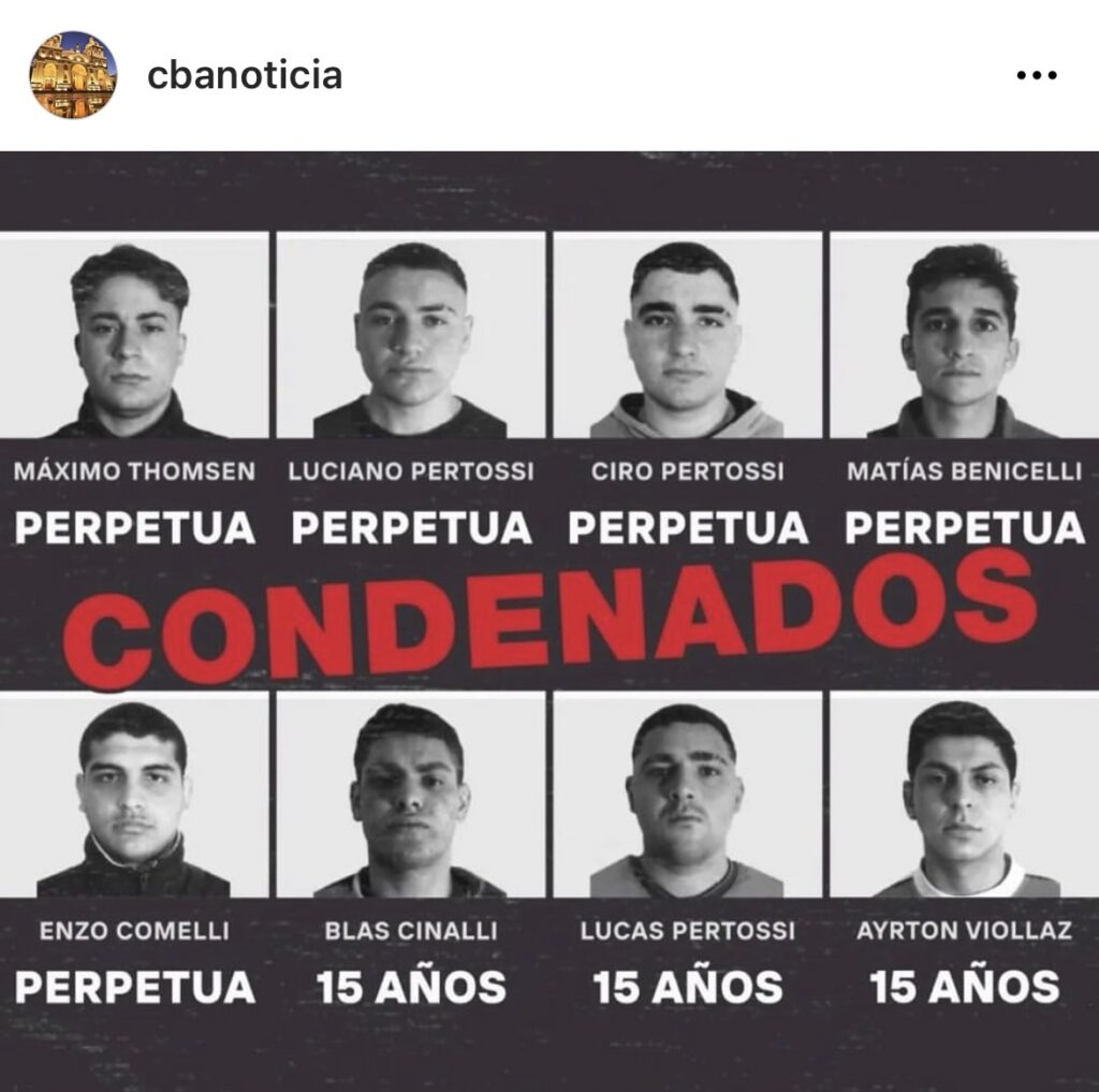 Ciro Pertossi, Enzo Comelli, Matías Benicelli y Luciano Pertossi, fueron juzgados como coautores penalmente responsables, recibieron la misma pena perpetua. Ayrton Viollaz, Blas Cinalli y Lucas Pertossi, como partícipes secundarios, fueron condenados a 15 años de prisión. Para Fernando Burlando fue” una justicia Débil , todos se merecían perpetua, vamos a pelear remarcó “.