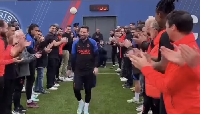 Leo Messi, camino por el pasillo de honor realizado por sus compañeros, tras sumarse a los entrenamientos del PSG. El capitán de argentina llegó el martes a Francia y participó de su primera práctica. COMPARTIR