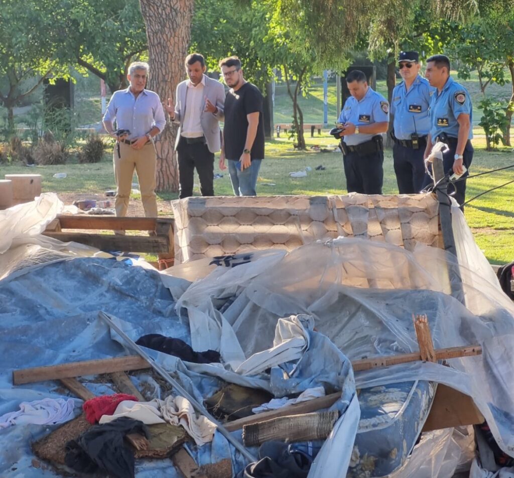 “ No vamos a permitir que se ocupe el espacio público de esta manera. Advertimos através de los domos policiales que un grupo de personas mayores de edad habían instalado unas estructuras precarias en el lugar, una suerte de chozas, y de oficio desplegamos un operativo para retirar a estas personas de Plaza de las Américas”, señaló el ministro de Seguridad, Juan Pablo Quinteros.