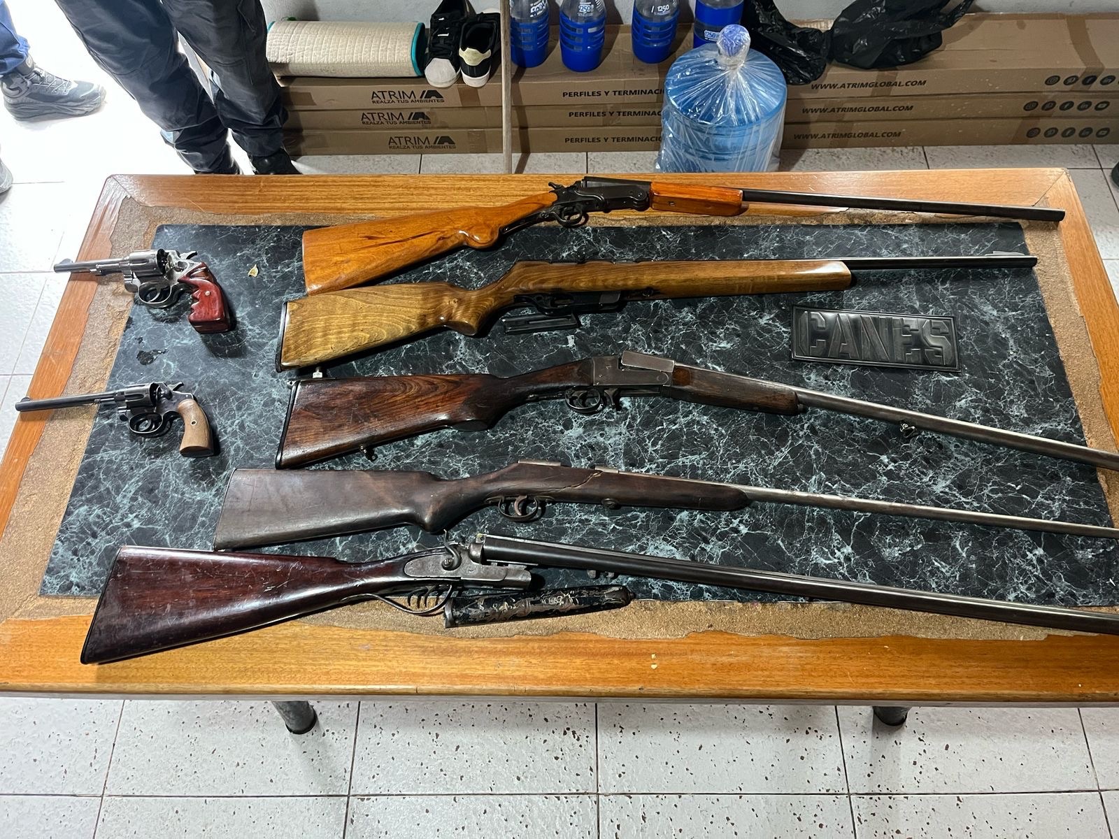 En el hogar donde se realizó el allanamiento había una carabina cal. 22 marca Bersa, una escopeta cal. 28 sin marca visible, una escopeta cal. 16 marca Sportman, una escopeta cal. 20 marca DemiBlock, un rifle Centauro sin identificación de calibre ni numeración, un revólver largo cal. 38 marca orbea, y un revólver largo cal. 32 marca Colt.