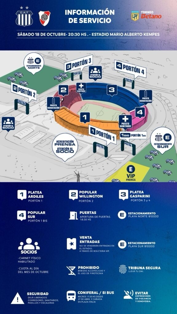 Las puertas del estadio abrirán a las 18:30 para que los hinchas de Talleres puedan ingresar.
