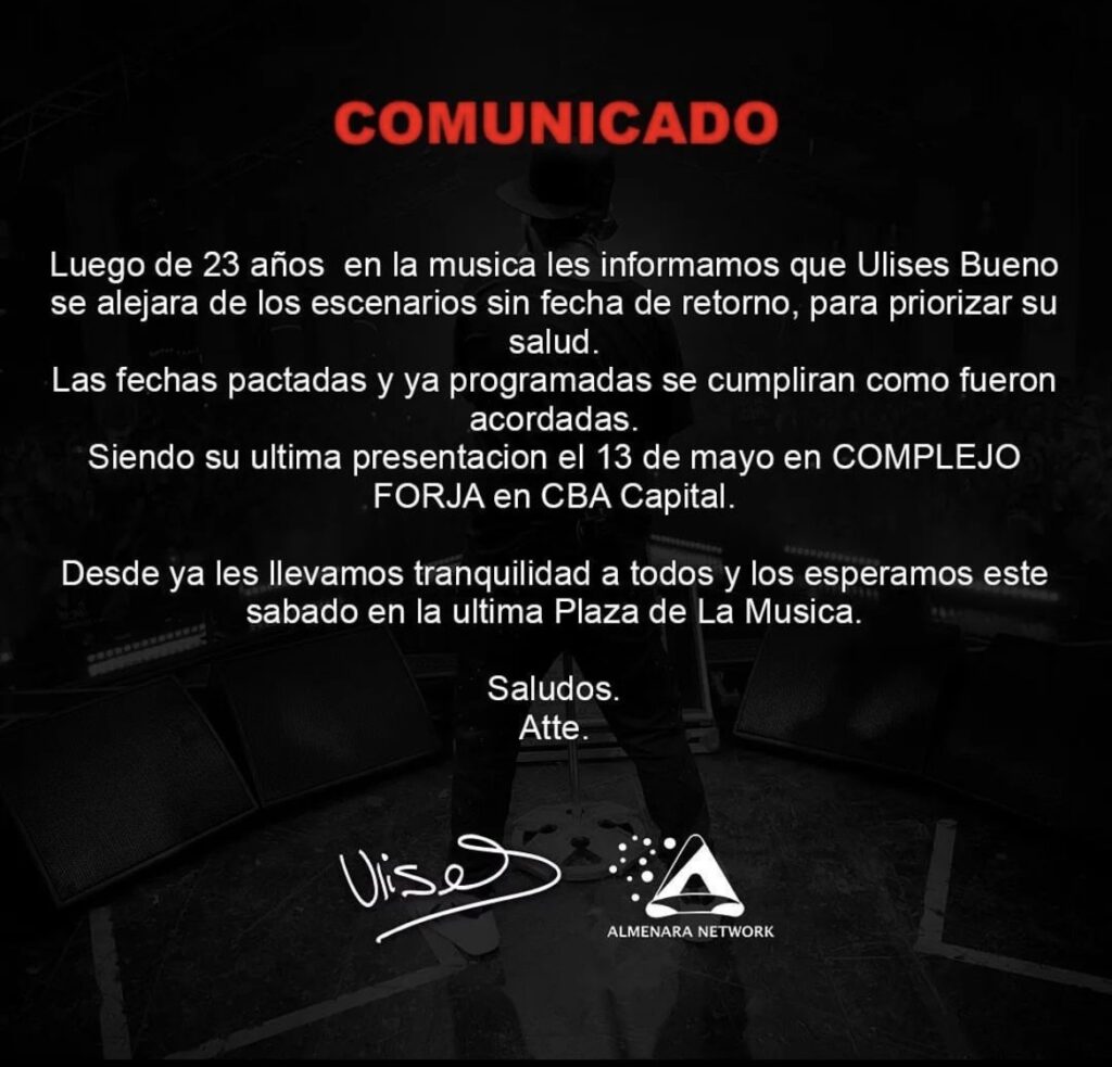 «Luego de 23 años en la música, les informamos que Ulises Bueno se alejará de los escenarios sin fecha de retorno para priorizar su salud», expresó el comunicado que rompió el corazón de los fanáticos que le brindaron su apoyo incondicional al cantante.